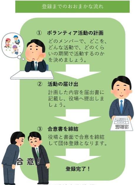 普段からご近所さん同士で道路や公園を掃除をしている方々、店の前の通りを美化している企業様、これからボランティア活動を始めたい方々など、この機会に団体登録してみてはいかがでしょうか。
